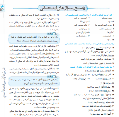 - ضمیمهها و آزمونها → آشنایی با افعال فارسیِ پرکاربرد، مشاوره شب امتحان، دو آزمون نیمسال اول، دو آزمون نیمسال دوم و دو نهایی منتخب (با پاسخ تشریحی).