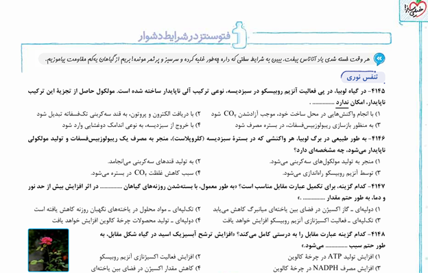 - مولفان، کتابهای درسی زیستشناسی را با دقت و وسواس بالایی زیر ذرهبین بردهاند، بههمین دلیل تستهای تالیفی را میبینیم که ایدههای جدید و خلاقانهای دارند، یعنی ممکن است در دورههای آتی با این سوژهها روبهرو شوید.