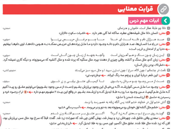 در برخی بخشها «نکات پیشرفته» برای دانشآموزان قویتر ارائه شده تا بتوانند به سوالات دشوارتر پاسخ دهند. از دیگر ویژگیهای خاص این کتاب، آموزش عروض و قافیه به روش شنیداری است.